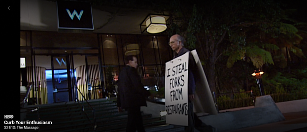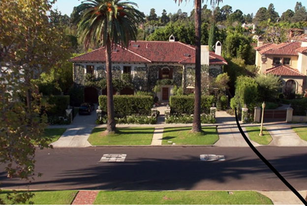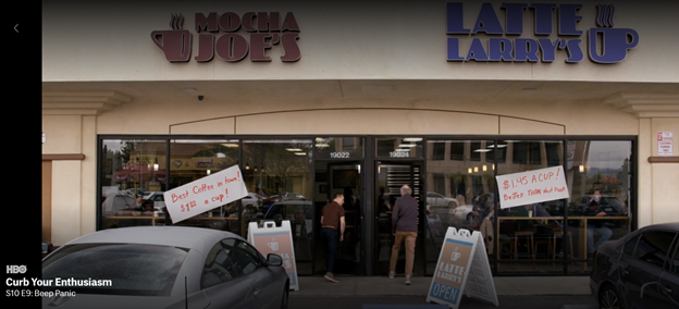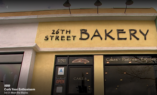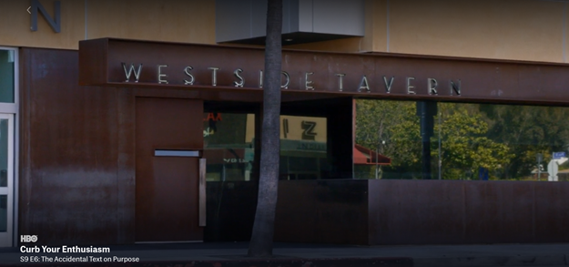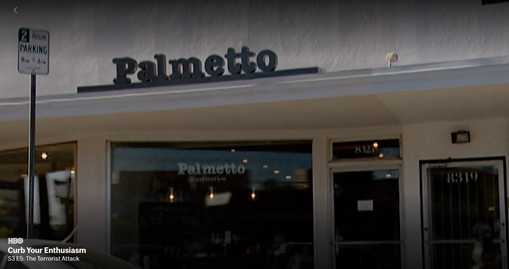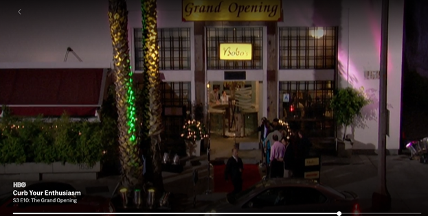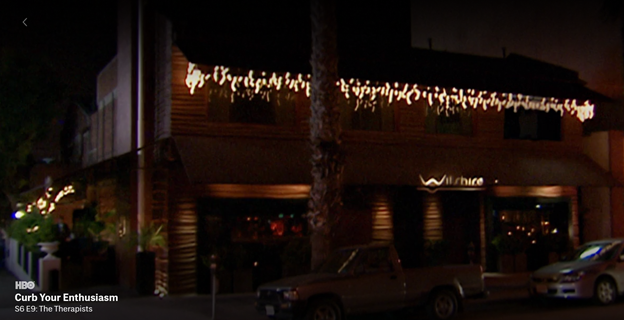 You might think I’m wrong about this one, but it’s definitely right. This was probably the hardest location I’ve had to identify. What gave me a clue that I could geek out on was a ferris wheel visible as Larry and Cheryl walked through the entrance. I had to assume that the ferris wheel was on the Santa Monica Pier. Ocean Ave is the only main street with the Pier visible down the street. I wandered down the street until I saw a building and trees that resembled (sort of) the scene. The camera angles make the show restaurant look way bigger than it actually is.